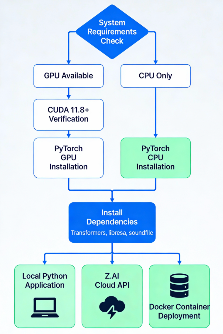 - Professional installation and deployment flowchart showing decision paths for GPU/CPU setup and three deployment options: