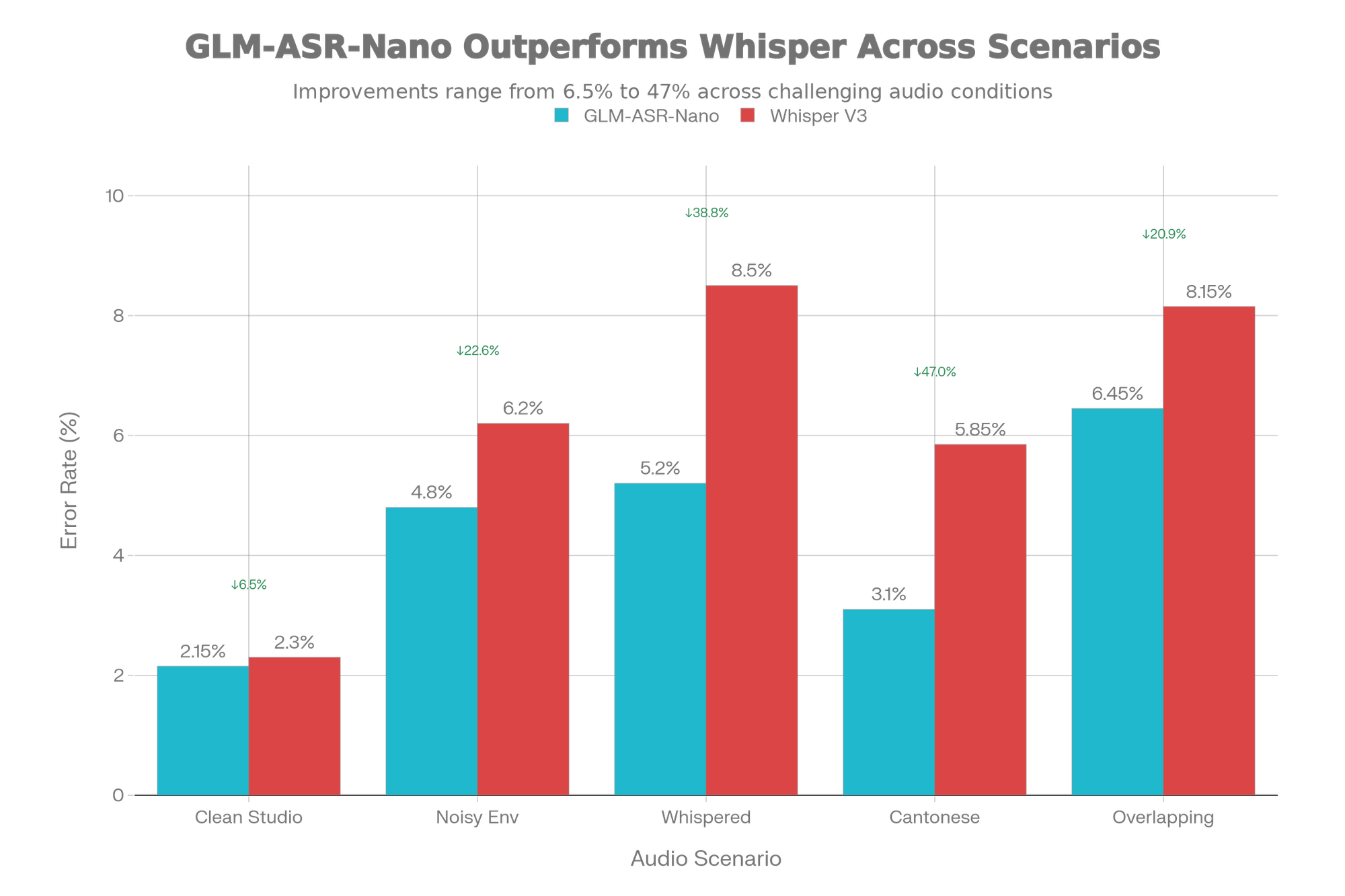 With just 1.5 billion parameters—comparable in size to OpenAI Whisper V3—GLM-ASR-Nano achieves industry-leading performance benchmarks while maintaining exceptional efficiency.